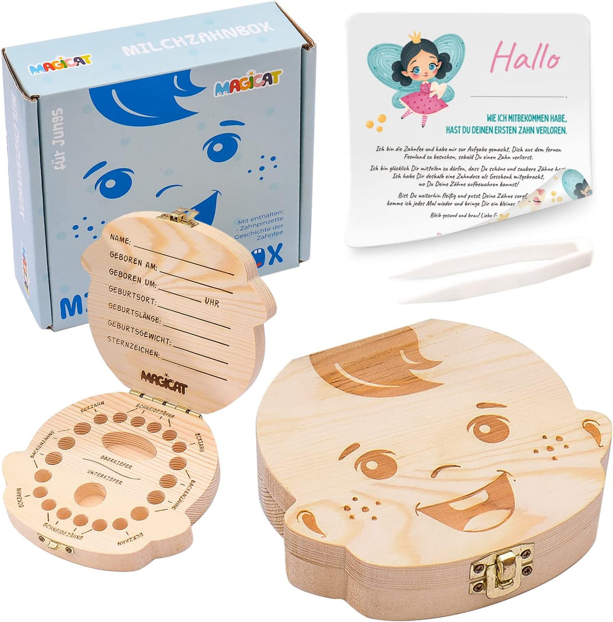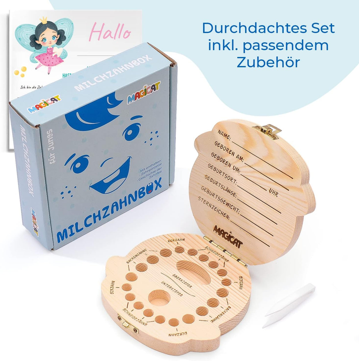 - Eine Pinzette, die Dir und Deinem Kind das Platzieren der Milchzähne vereinfacht und eine Geschichte der Zahnfee sind im Set inklusive. Diese kannst Du Deinem Sohn beim ersten Zahn vorlesen und übergeben - er wird begeistert sein